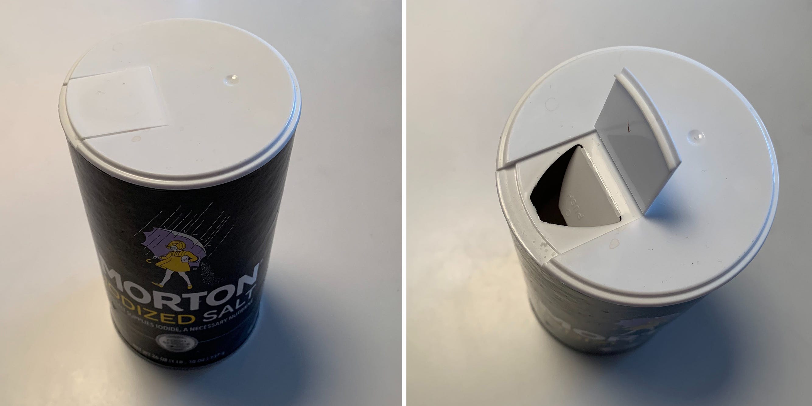 But mostly I don't measure out the salt. Next time I was cooking, I reached over for the canister and popped it open and realized, for the first time, that this setup had engineered away the spout.