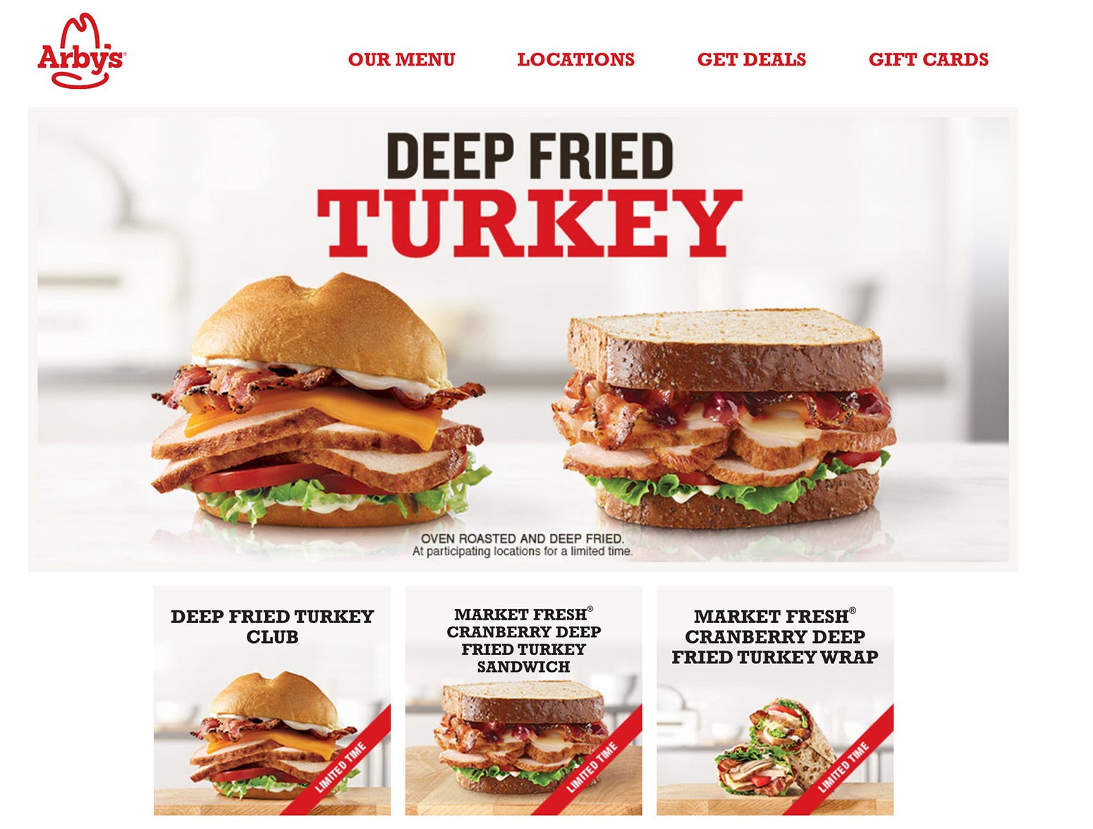 I have been seeing advertisements under the umbrella of the very good communication ad campaign slogan ARBY’S: WE HAVE THE MEATS, where they tout the different types of meat you can get on a sandwich. Right now there are announcements for an assortment of “limited time” fried turkey sandwiches. Arby’s cracked the code on marketing fast food turkey: DEEP FRIED.