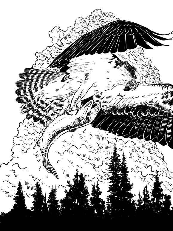 "Look below," said the fish, flipping a fin to indicate the water. Where it gestured, a school of fish broke the surface. The osprey could see even from a height that they were plump and slow-moving.