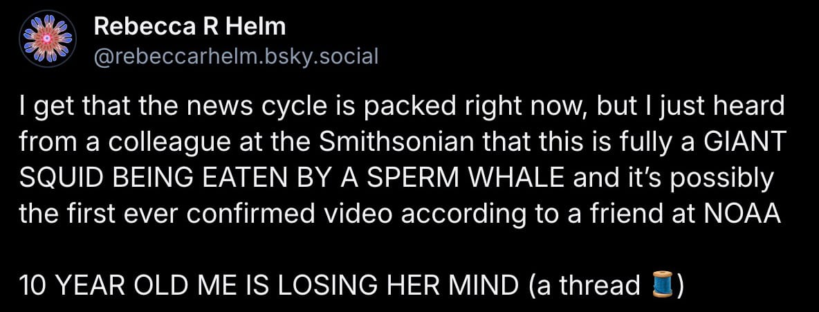 A DIVER TAKING pictures and videos of whales and posting them to Instagram appears to have captured footage of a sperm whale (Physeter macrocephalus) swimming toward the surface with the mangled remains of a giant squid (Architeuthis dux) in its jaws. Scars on sperm whales and squid beaks in their guts have long attested to the fact that the whales dive a quarter- or half-mile down, into the lightless ocean depths where the giant squids live, to hunt them. Before this, though, the spectacle of one behemoth feeding on the other belonged to the impenetrable blackness of the aphotic zone. Now—via the Bluesky account of the marine ecologist Rebecca Helm, who posted that her expert sources told her the video looks genuine—here is the whale in wave-refracted sunlight, pale tentacles trailing from its long mouth, darkening the water with the now-useless ink of its prey.