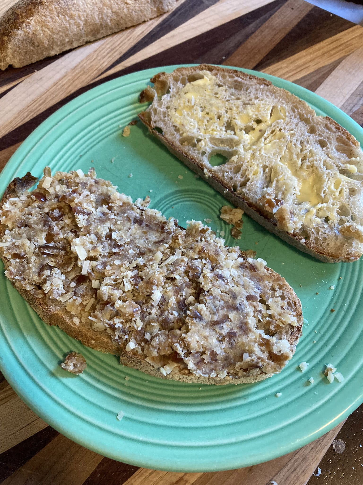 I moved the dates from the pantry to the fridge last week because we lack central air and the kitchen gets hot, which made it hard to mix initially, but by the time I went to spread it had warmed, making it easier to move across the bread.