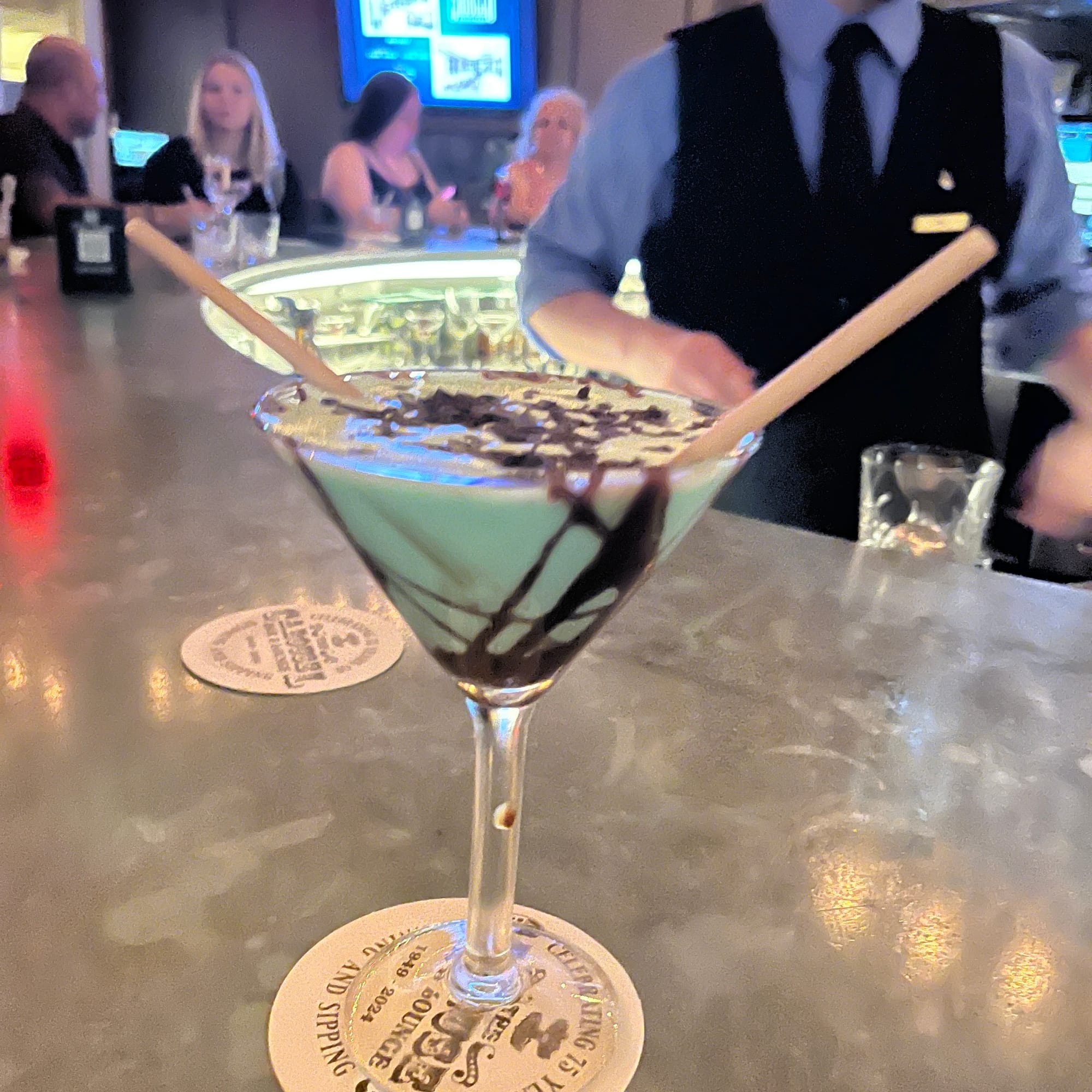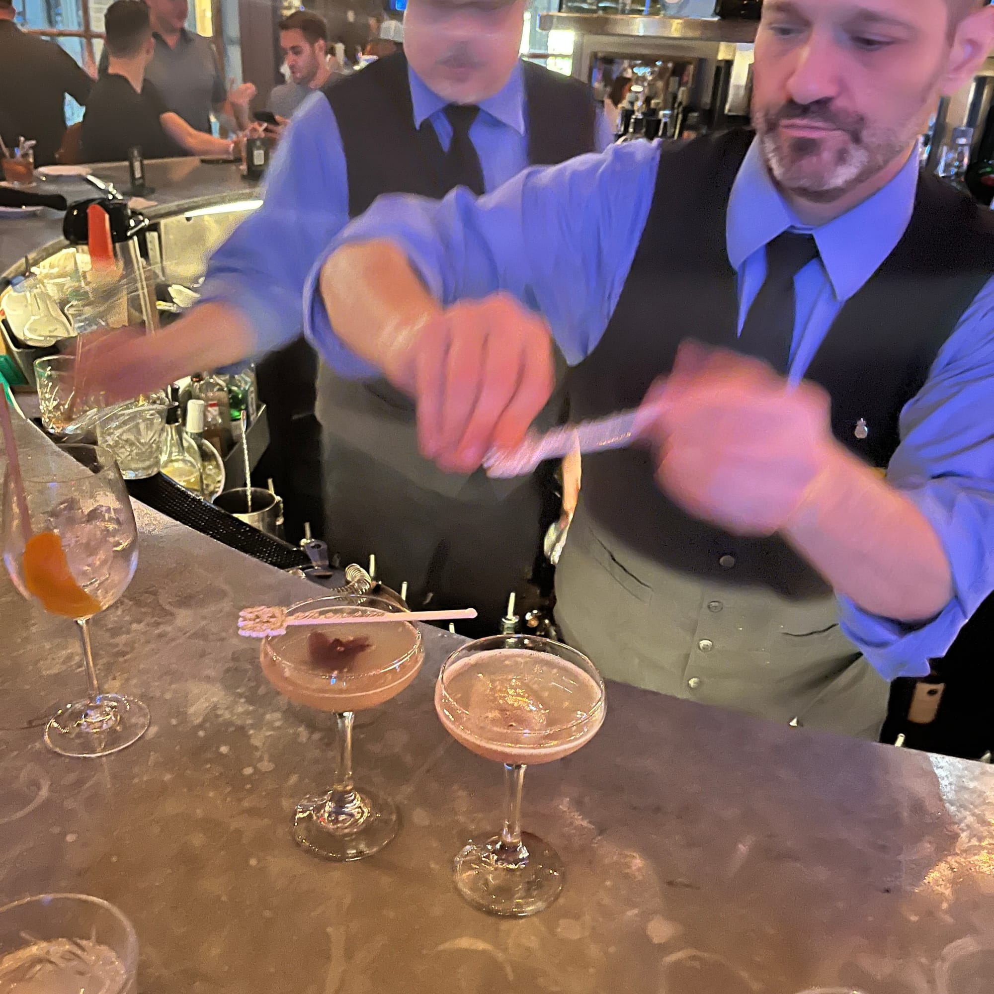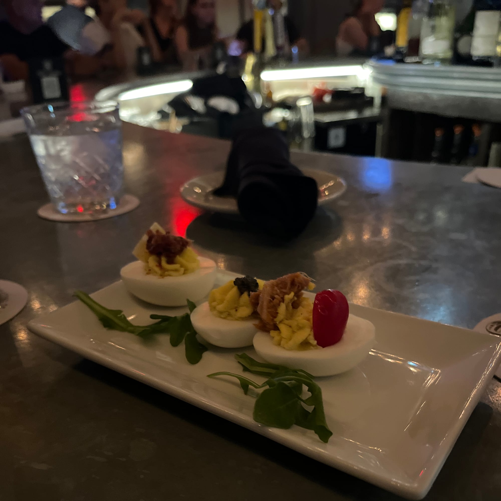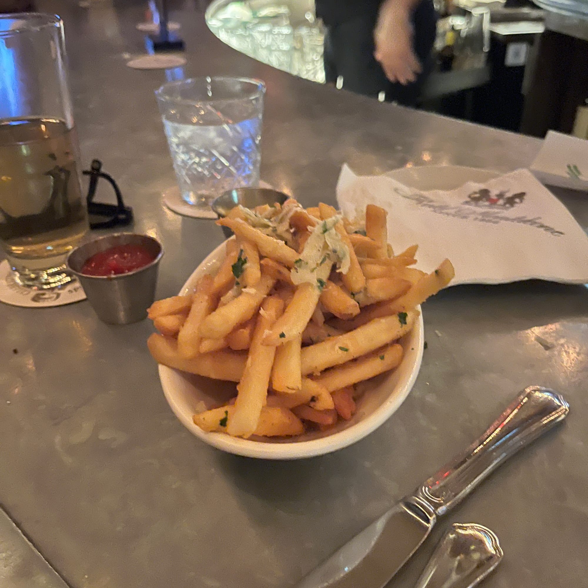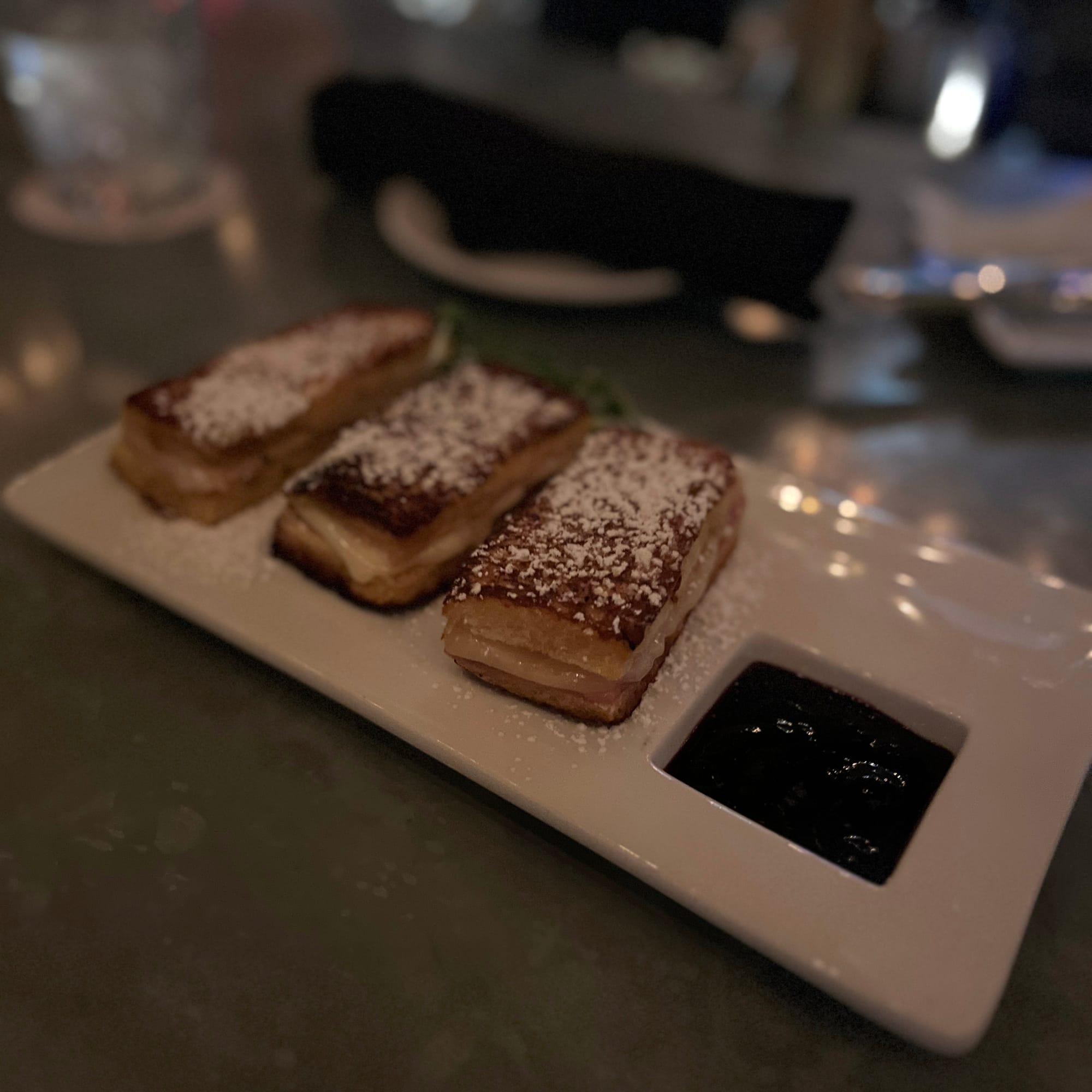 This was our session at the Hotel Monteleone Carousel Bar. A tour de force of cocktails bankrolled by a friend in Baltimore as a gift to the Graduate. The green dessert-looking drink was exactly that, sweet, minty fresh, last thing in the world we woulda ordered, we went at it Lady & The Tramp style and drained it in three seconds. Delicious. The deviled eggs, I'm not gonna lie, mine are better. The truffle fries were a slam dunk, and the little bars dusted with powdered sugar were mini Monte Cristos, fried brioche with ham, turkey, Swiss, Creole mustard, and berry compote. Crazy savory.