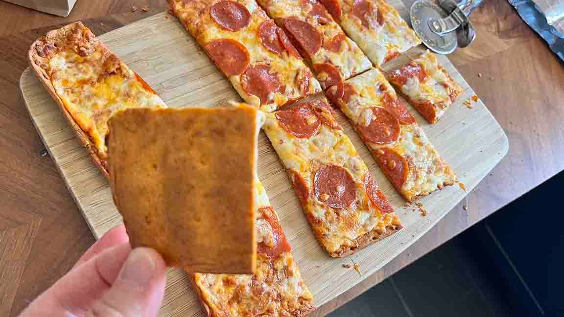 While it was baking, the household consensus was "it smells like a goddamn Cheez-It." The cracker-y (again, I didn't get it to be crispy) crust def visually resembles a Cheez-It, but any Cheez-It similarity in the taste is not apparent. It might be on account of the cheese and sauce, which were nice, the cheese is real and abundant, and the sauce is oily and tangy. I think this would be a fun pizza to get for kids, for a different experience in the Cheez-It-verse. I will buy it again (if it's on sale) because I wanna try to get the crust crispy, but overall, it ain't bad, a comforting late-night munch for sure.