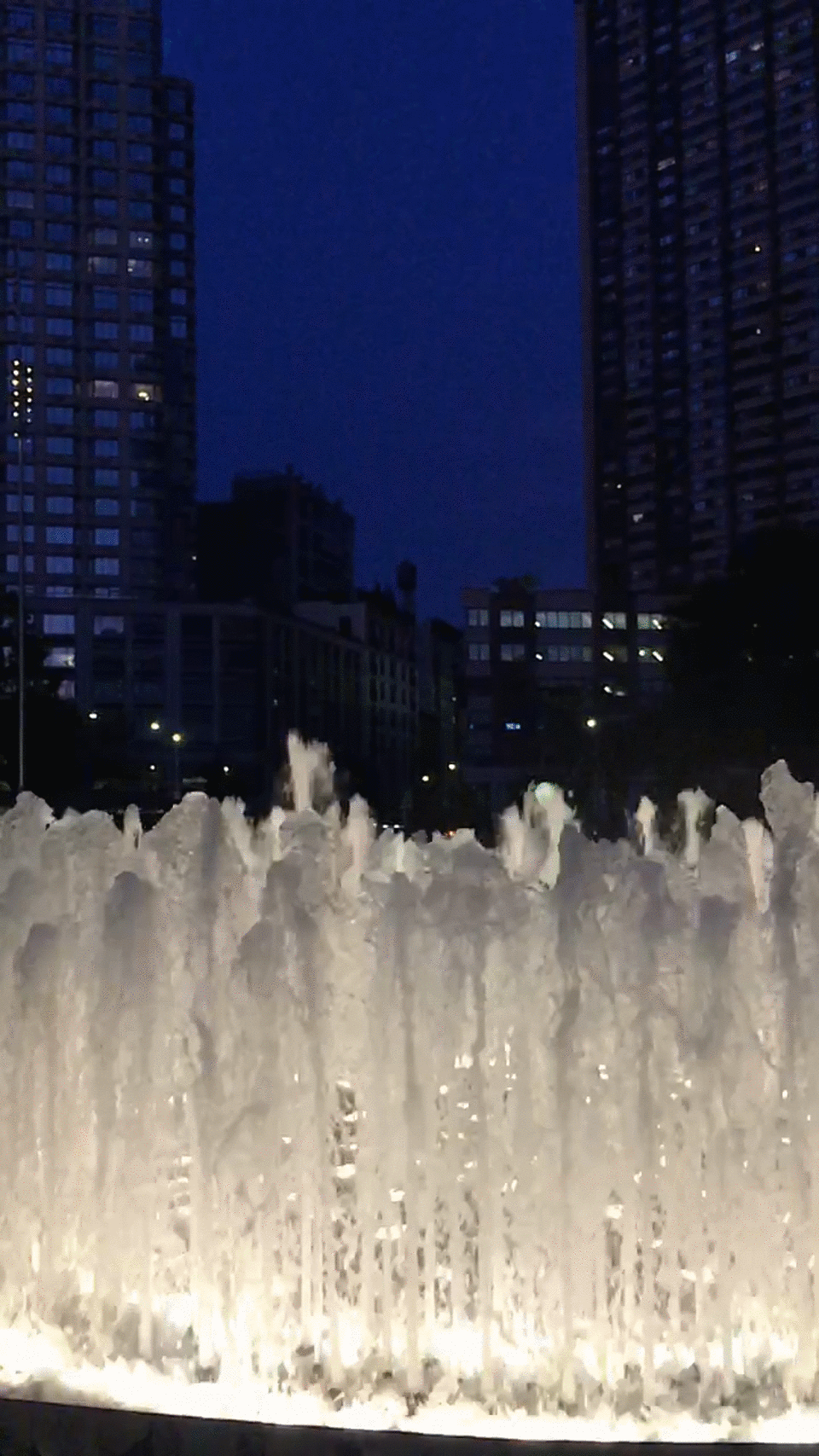 It worked out, though. Thick, solid jets of water rise and fall together, and then apart, so that the cake grows taller—past the children's eyes and then the adults', the jets like flourishing cornstalks—and then it tilts, or differentially sinks in the middle, or differentially rises in the middle, or: goes blasting high up into the air, launched by air cannons that go whump whump whump, and then splats down again. The cannons were going whump, and the water kept glowing as it burst into chrysanthemums overhead, against a sky that was still luminous deep blue, not the orange-stained darkness of the full city night. The water subsided to almost nothing, as still as the smoky dead air after the fireworks finale is spent, and then with a whoosh and the whumps it would arise and fling its illuminated burden upward again. We may have been jaded enough to have forgotten to think about it being there, night after night, closer than the hardware store or the FedEx Office. But we weren't too jaded, once we were there again, to keep standing, heads tipped back, staring up at the show.