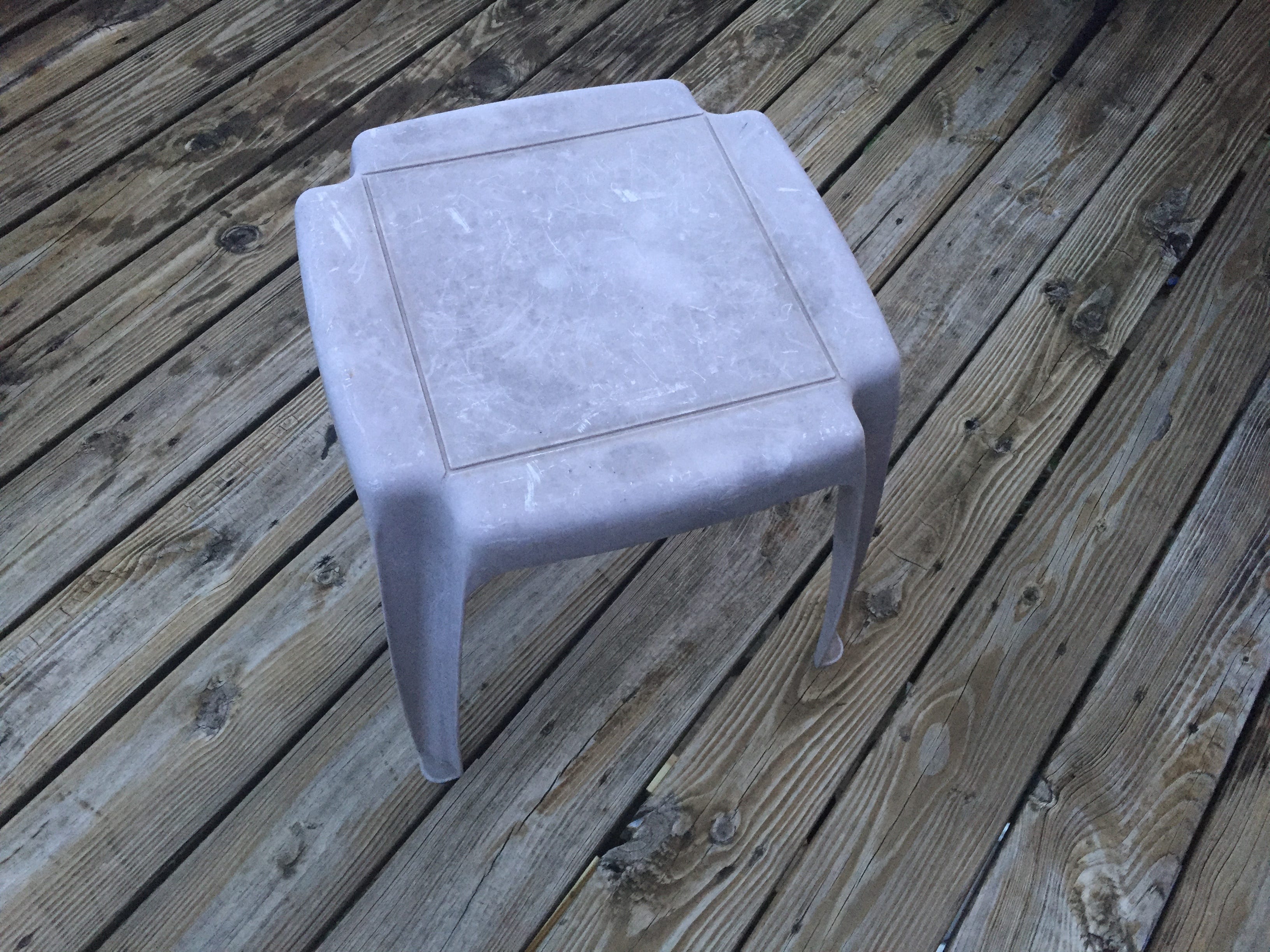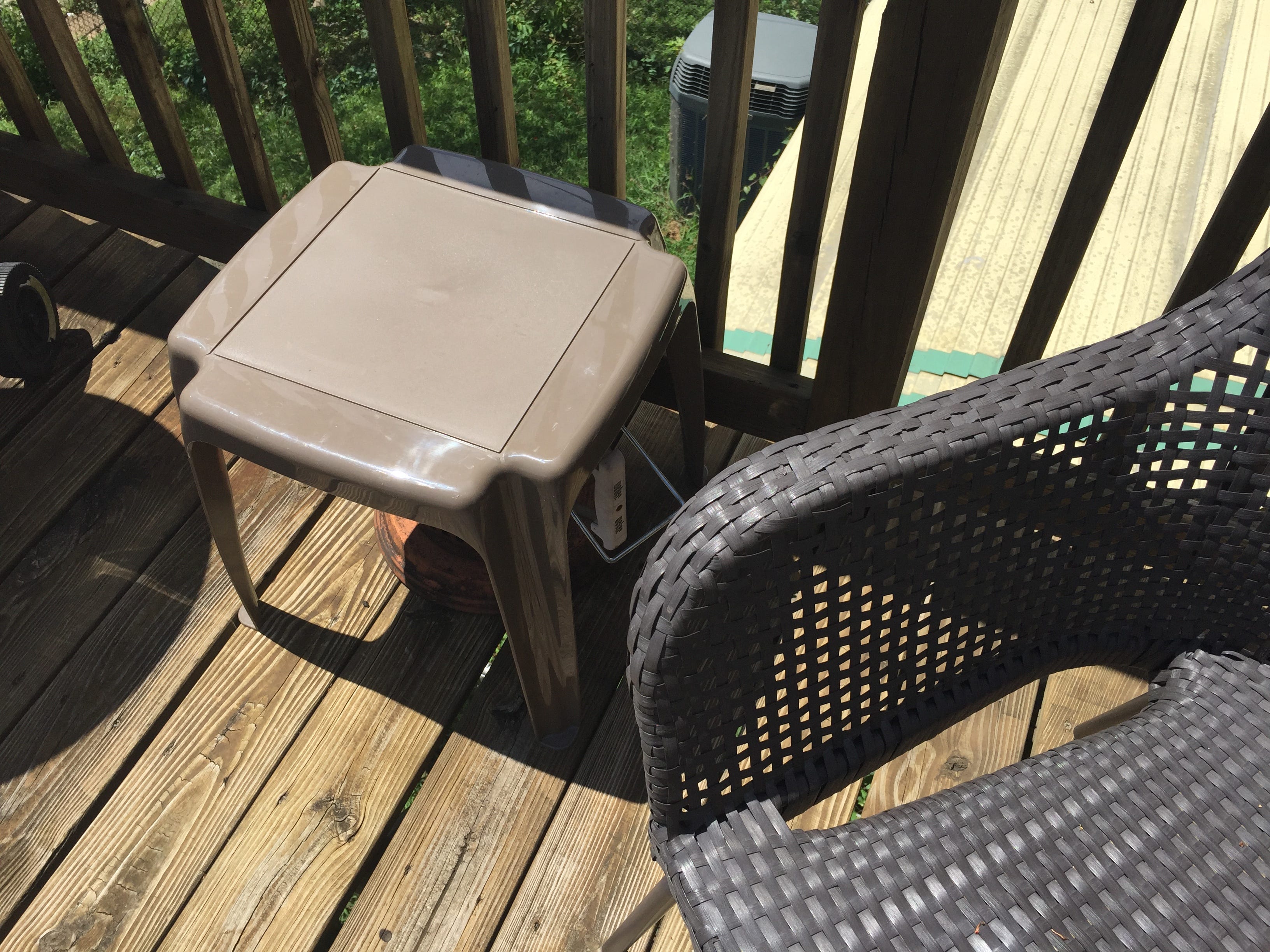 In that position near the grill it also became the place to rest anything that was not glowing hot: an oven mitt, a platter of meat ready to be grilled, another drink. Years of the outdoors induced plastic fatigue, a slight crackling in the structure whenever you picked it up, and a complete loss of its smooth shiny coating, an unsightliness compounded by the onset of grime penetrating the now uncoated surface. An expedition to IKEA produced a pricey teak outdoor table that would be placed nowhere near the BBQ, and a trip to the Home Depot for an unrelated matter turned up a successor to the plastic table, in a better color. The original is in the recycle bin.