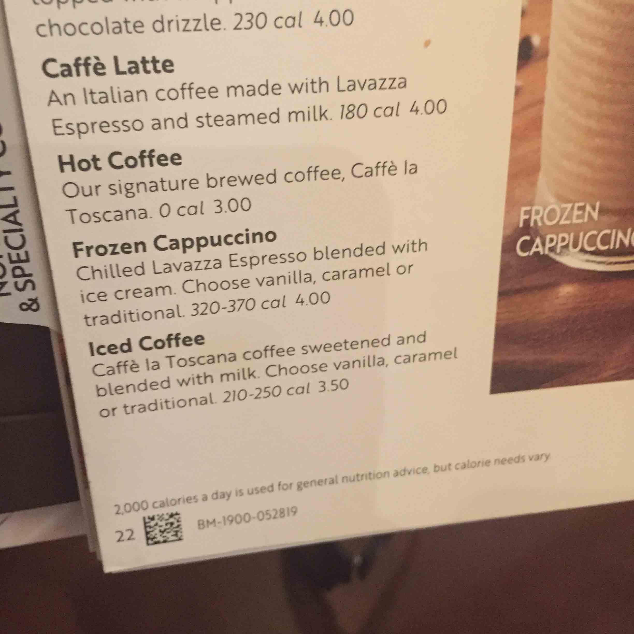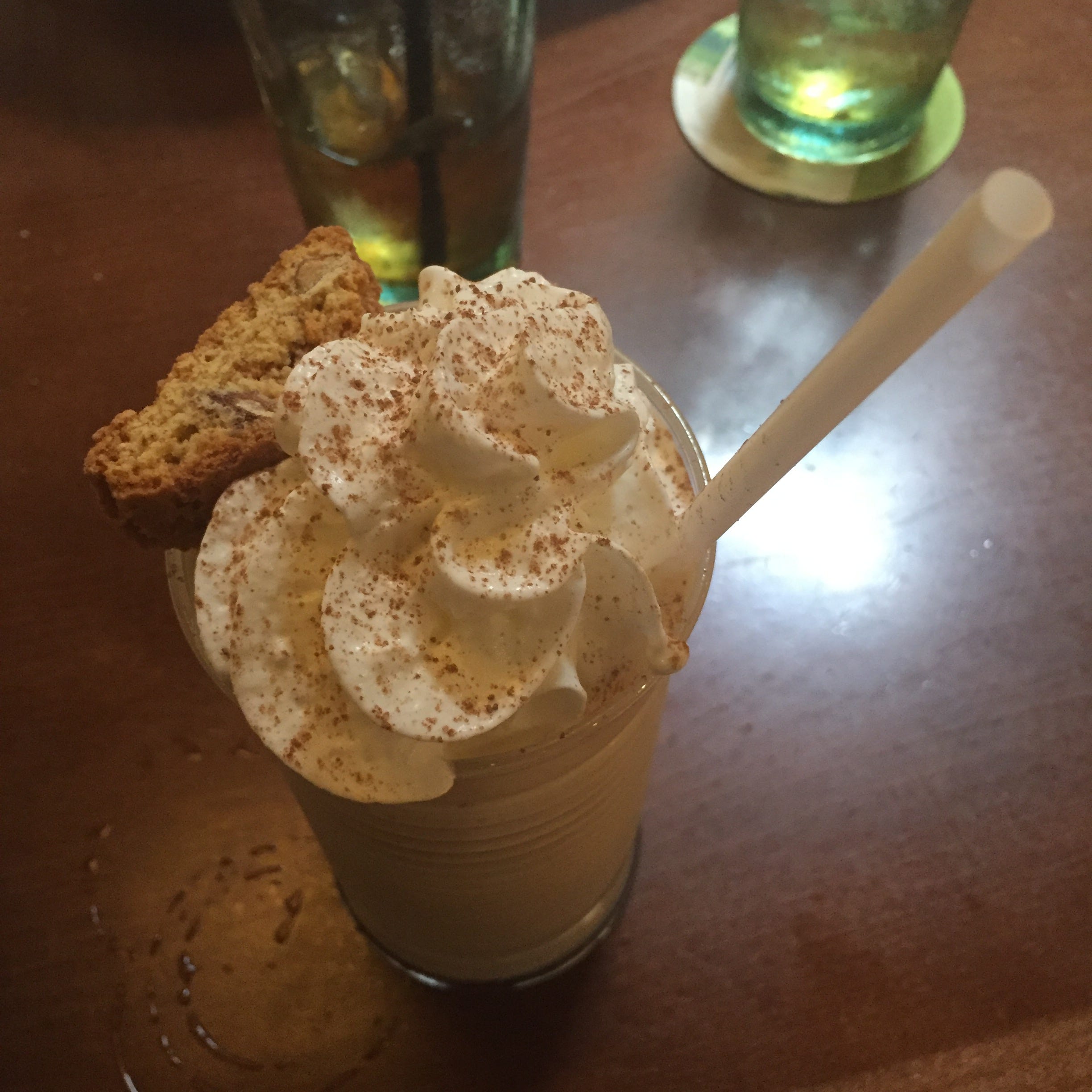 I would like to leave you with this; my dessert choice, a “Frozen Cappuccino,” which also includes ice cream in it, and wowzers, this kicks hell out of the Starbucks Frappuccino, woof! Urgh! Glurgle. I ate all the calories.