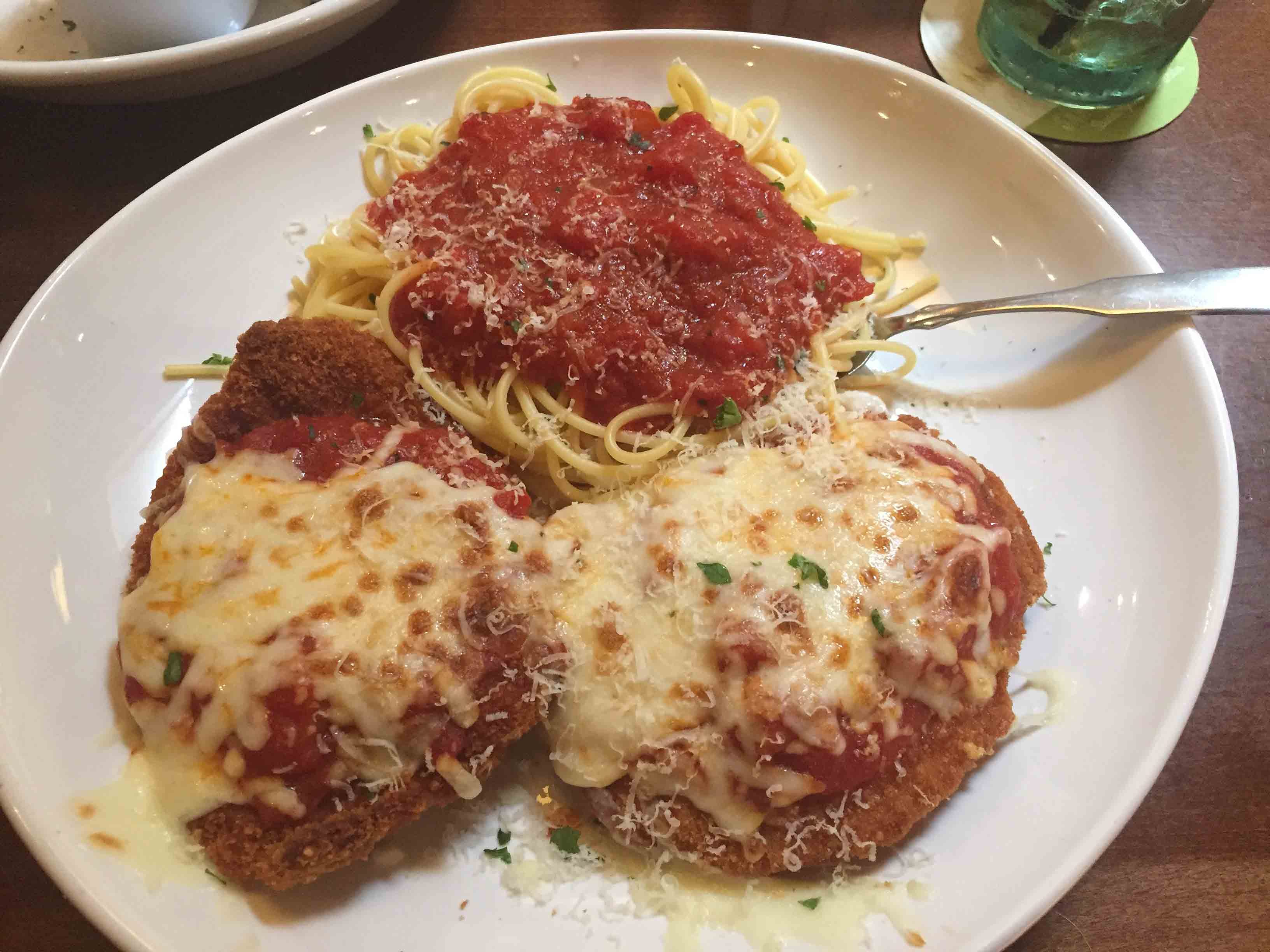 My wife ordered the salmon, which was good, but it’s salmon. Hey though, look at this nice big portion of healthful broccoli here. It somehow had cheese in it, like an infusion or a dusting of parmesan. Parmigiana? Cheese of an Italian Origin.