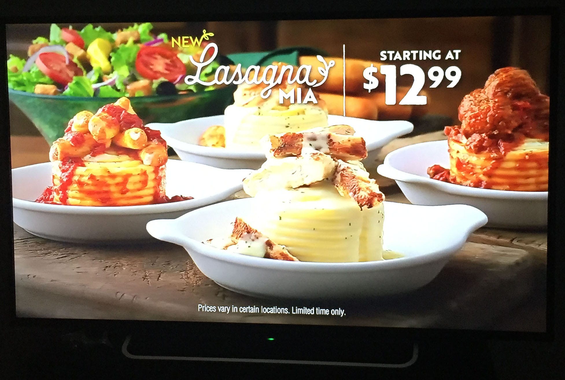 IT’S FUN TO make fun of the Olive Garden restaurant because they are very average and suburban, and personally I think they get a bad rap on their food, which is just various takes on “Red Sauce” Italian, because they do weirdo things like this modular lasagna deal I saw on TV the other day, featuring what appears to be a lasagna noodle wrapped sideways to form a vertical tube formed around a half-pound of cheese, which is then enrobed in the topping of your choice. It’s a mass-market “wow factor” food item.