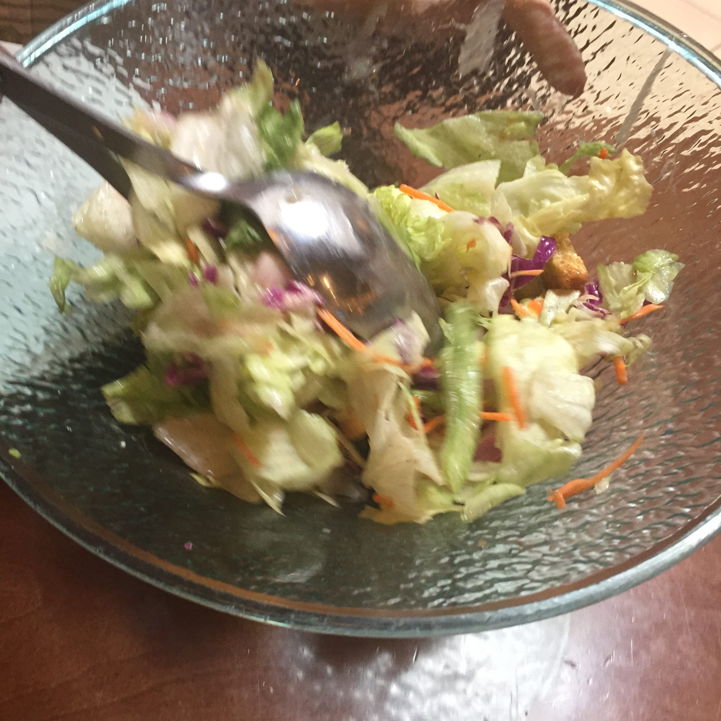 First of all, the salad is nice, it’s not anything crazy, but it’s perfectly fine and simple tossed salad, some iceberg, some romaine, shredded carrot, cabbage, black olives, and the dressing is good and tasty Italian-type dressing, but def not any kind of low-calorie situation by the taste of it. They give you one bowl that will yield you two good-sized plates of salad. We asked for one refill on the salad. The breadsticks I could do without; they are skwushy, puffy, and bland little mini-hoagie rolls. I like the skinny crunchy type of breadsticks.