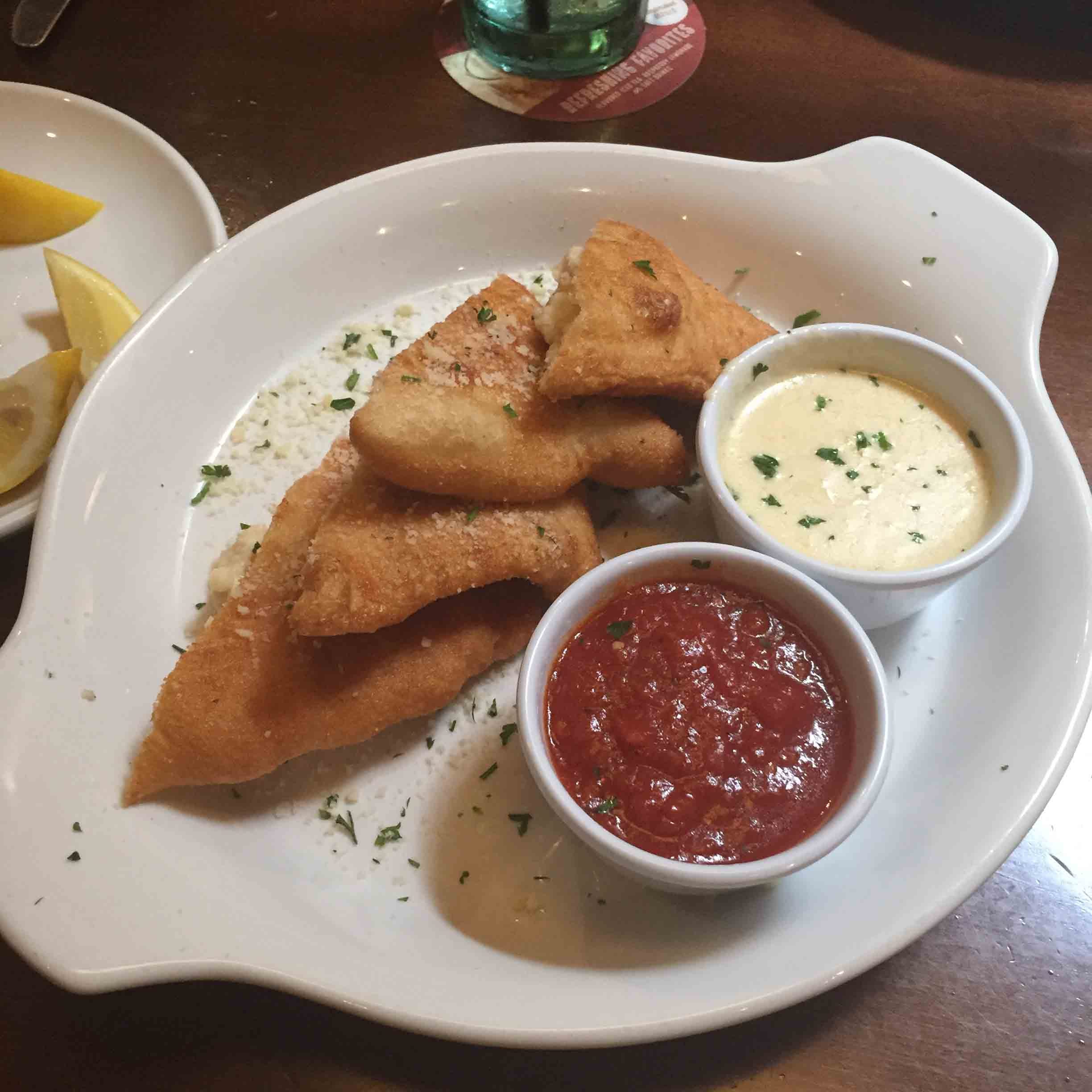 I took a risk with my appetizer and went for a thing called the Chicken Alfredo Pizza Frita, it’s a play on “pizza fritta,” aka “funnel cake,” aka “elephant ear,” aka some pizza dough dropped into a tub of hot grease, yum-yum, and I am being non-ironic when I state my yums.