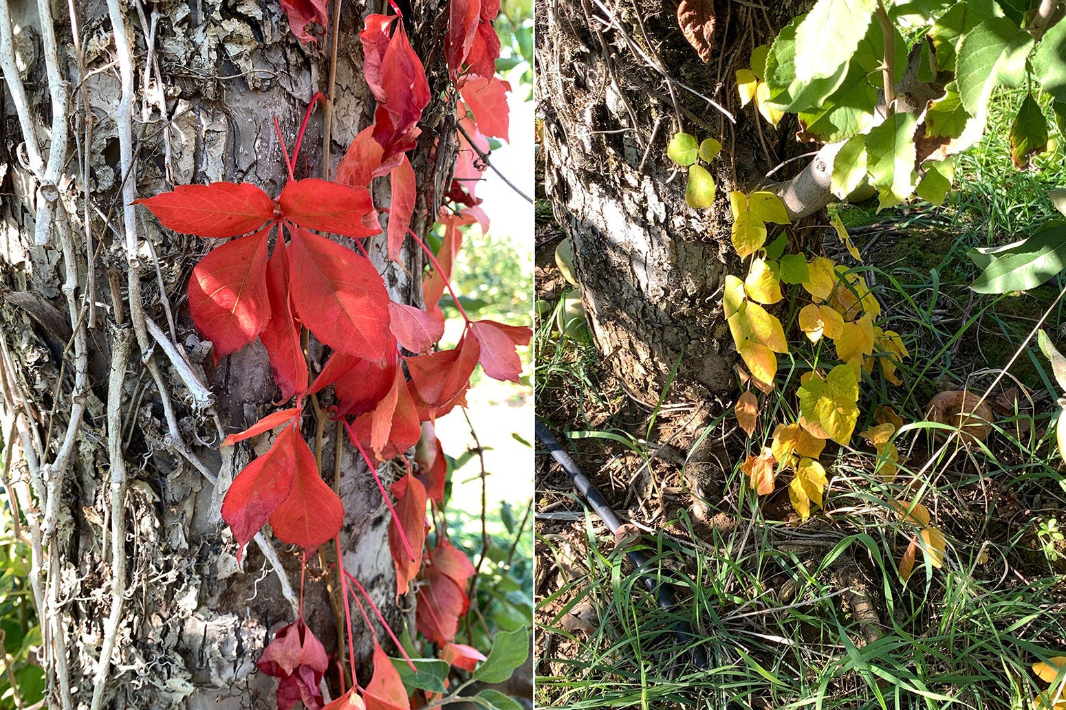 TO FOLLOW UP on August's coverage of how the dread poison ivy and harmless Virginia creeper insist on showing up together, here are photographs of two Granny Smith apple trees growing side by side in a New Jersey orchard. One has the scarlet fall foliage of Virginia creeper climbing its trunk. Its neighbor has the yellow fall foliage of poison ivy.