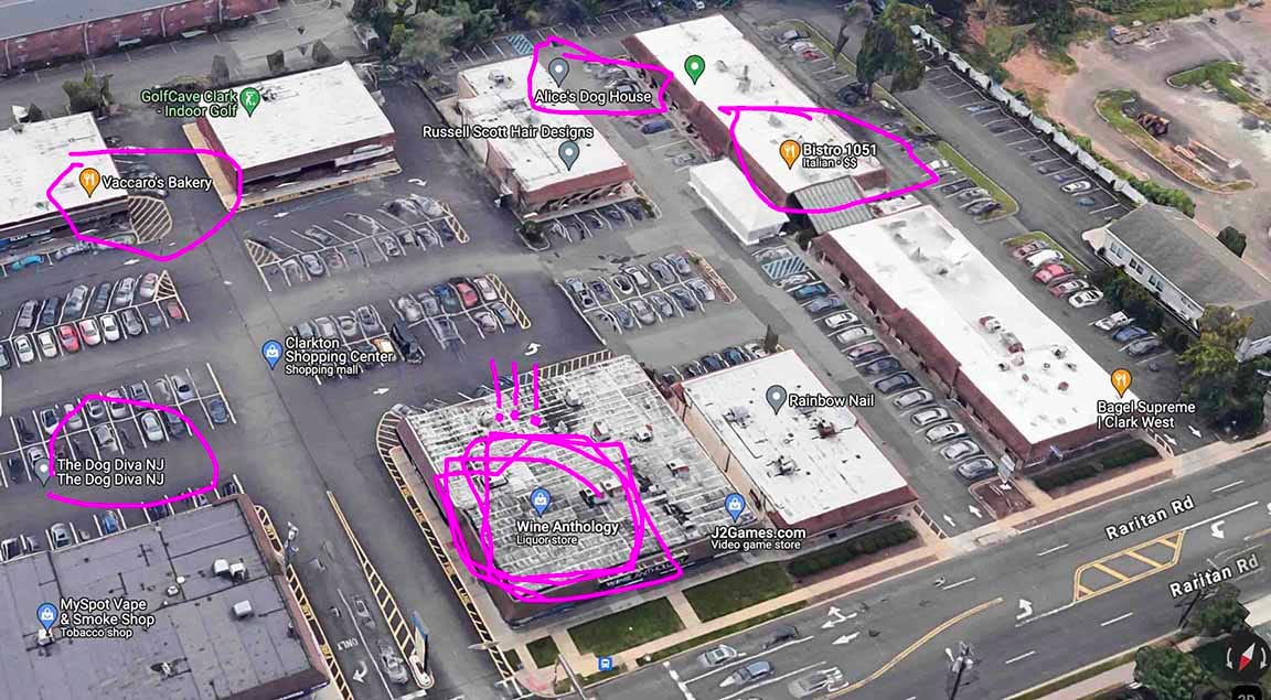 But our curiosity about the world of Sal Bonnacorso was not satisfied. Via Google Maps, we did a bit of exploring in Clark, New Jersey. What we found is like the map for the beta version of an unauthorized video game based on The Sopranos. Grand Theft Prosciutto: Strip Mall City.
