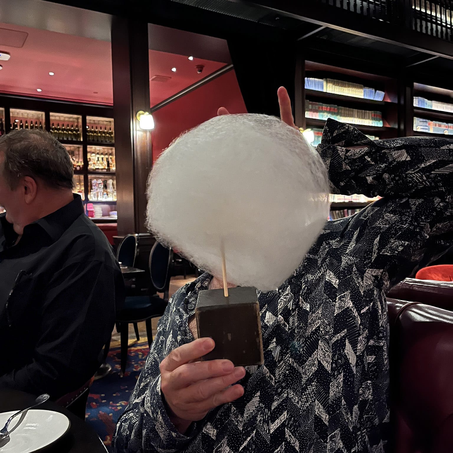 It was my birthday, and we went to NoMad Library Restaurant, where the thing they do for you on your birthday is a blob of "spun sugar" (cotton candy, c'mon) on a stick on a block which I stuck in my face. No leftover.