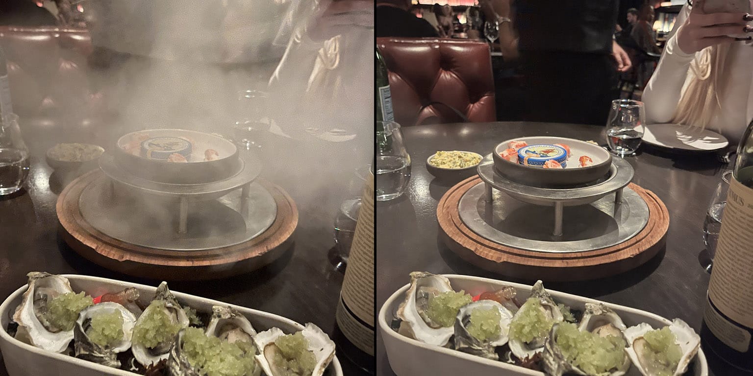 A real appeti-puzzler at the NoMad Library (real books on the shelves, dunno if you can check 'em out) was a caviar and crab leg mouth amusement, billed as "smoked," and I guess it's one of those "wow factor" gimmicks for a restaurant, it comes out on a board with a glass dome, and there's smoke inside. They lift the dome and voila! Smells like smoke, pleasantly. However, the caviar is in the tin, so I don't get it. It did seem to affect the crab leg, but no big deal. Kind of a small portion, seafood always problematic as a leftover, and caviar is never left on the table by anyone I know, so no leftovers! Would not order again.