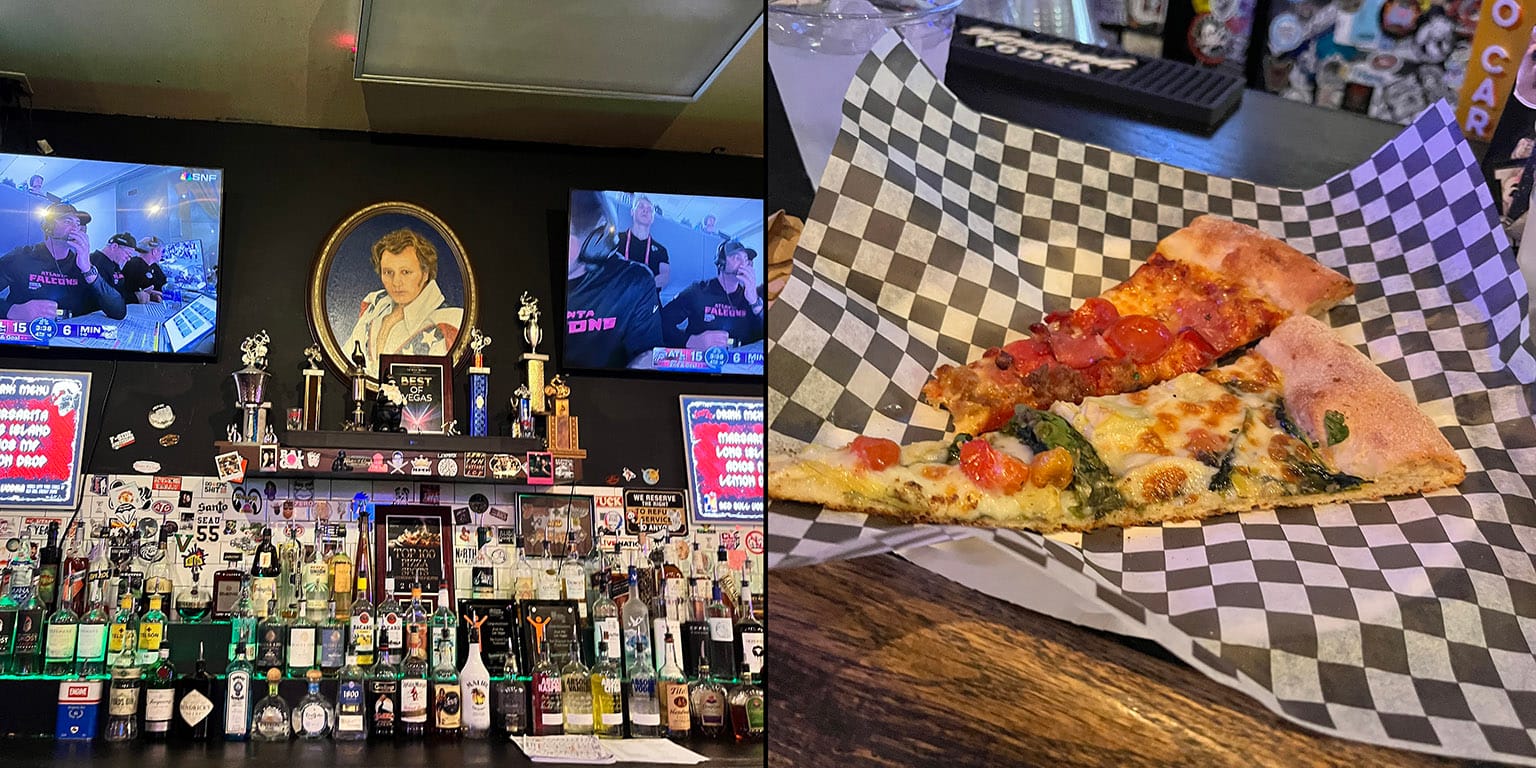 I guess this turned out to be mostly about non-leftovers, but we only got slices at the Evel Knievel-themed pizza place, they were reasonably New York-ish, and the toppings were perfecto, one was vegetables, including artichoke, classy, and the other one spicy pepperoni, again, didn't order whole pies, shoulda, because these would have been great on the plane home.