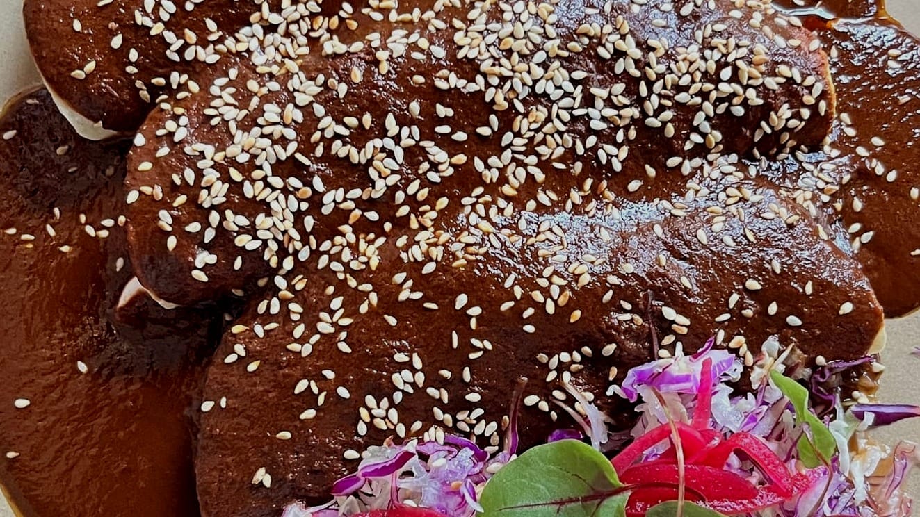 On the menu it says "Mexican custard, caramel piloncillo, extra virgin olive oil soil, and freeze-dried mandarin," and I don't know if "soil" is a typo or some sorta deep-food term, but this was wild, incredibly sweet on top and creamy-creamy custard at the bottom. Perfect with some nice cinnamon-tinged coffee. No leftover! We got chips and guacamole, perfect, and some chicken flautas, and a buncha other stuff, so there was no way I could polish off my enchiladas and bean & rice. Leftovers packed up in a tight plastic to-go container, a night in the hotel fridge, five hours on the plane, and home. Perfect luncheon the next day.