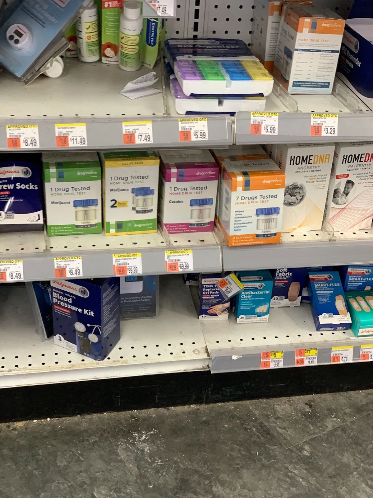 I went well after lunch, and there was no line. Data reception for my powerful pocket computer-phone is weak that deep in the store, so when I do wait in line, I have to look at things around me rather than the screen. Below the pharmacy counter are more shelves of products: home drug-testing kits for marijuana, cocaine, or a seven-drug combination; beside those are home DNA testing kits, one for ancestry and one for paternity. These used to be unknowable and private facts: what substances are passing through one's body, or what one's own molecular identity might be—which is to say, the sex lives of one's parents and grandparents. The kits are stacked in sloppy rows, right by the generic adhesive bandages and the pill organizers. I take photos of those shelves on my computer-phone to remind myself that I really do live in the future, and this is how the future came out. When I type "drug" into the computer-phone’s search bar, it finds the photos for me.