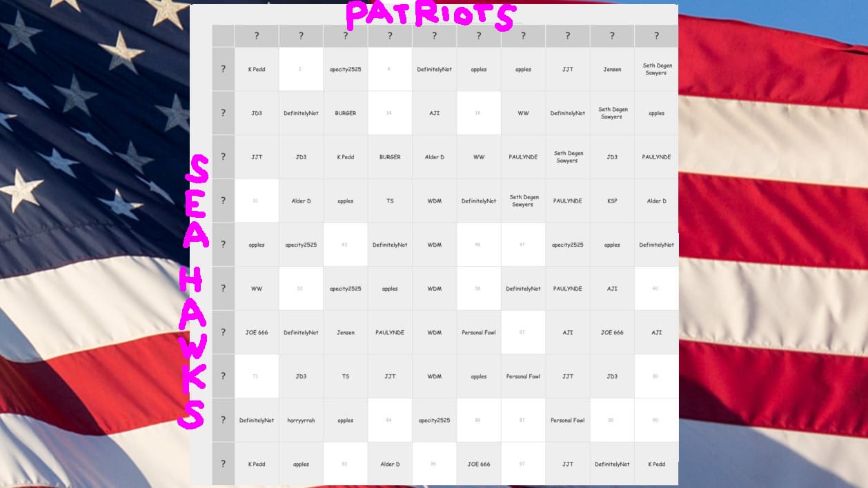 Or all this Artificial AI! There’s gonna be a hundred commercials for gambling, and commercials for AI, but wake me when there’s the commercial for AI + gambling that will tell me the score of the game! Ha! Parlay that! Seriously though, if you are gonna gamble, find somebody who's doing one of these totally random grid-things, and then you super won't care who wins because you will be rooting for the number that's at an intersection of vertices or something. I am not good at math. Intersection? Anyway, that's what I'm doing, I bought a square at the Legion hall, and I will be cheering for a number!
