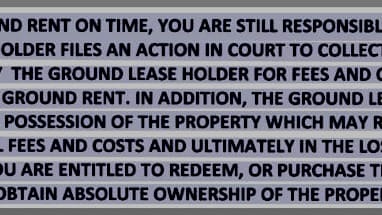 IF YOU FAIL TO PAY THE GROUND RENT ON TIME, YOU ARE STILL RESPONSIBLE FOR PAYING THE GROUND RENT. IF THE GROUND LEASE HOLDER FILES AN ACTION IN COURT TO COLLECT PAST DUE GROUND RENT, YOU MAYBE REQUIRED TO PAY THE GROUND LEASE HOLDER FOR FEES AND COSTS ASSOCIATED WITH THE COLLECTION OF THE PAST DUE GROUND RENT. IN ADDITION, THE GROUND LEASE HOLDER MAY ALSO FILE AN ACTION IN COURT TO TAKE POSSESSION OF THE PROPERTY WHICH MAY RESULT IN YOUR BEING RESPONSIBLE FOR ADDITIONAL FEES AND COSTS AND ULTIMATELY IN THE LOSS OF YOUR PROPERTY. AS THE OWNER OF THIS PROPERTY, YOU ARE ENTITLED TO REDEEM, OR PURCHASE THE GROUND LEASE FROM THE GROUND LEASE HOLDER AND OBTAIN ABSOLUTE OWNERSHIP OF THE PROPERTY.