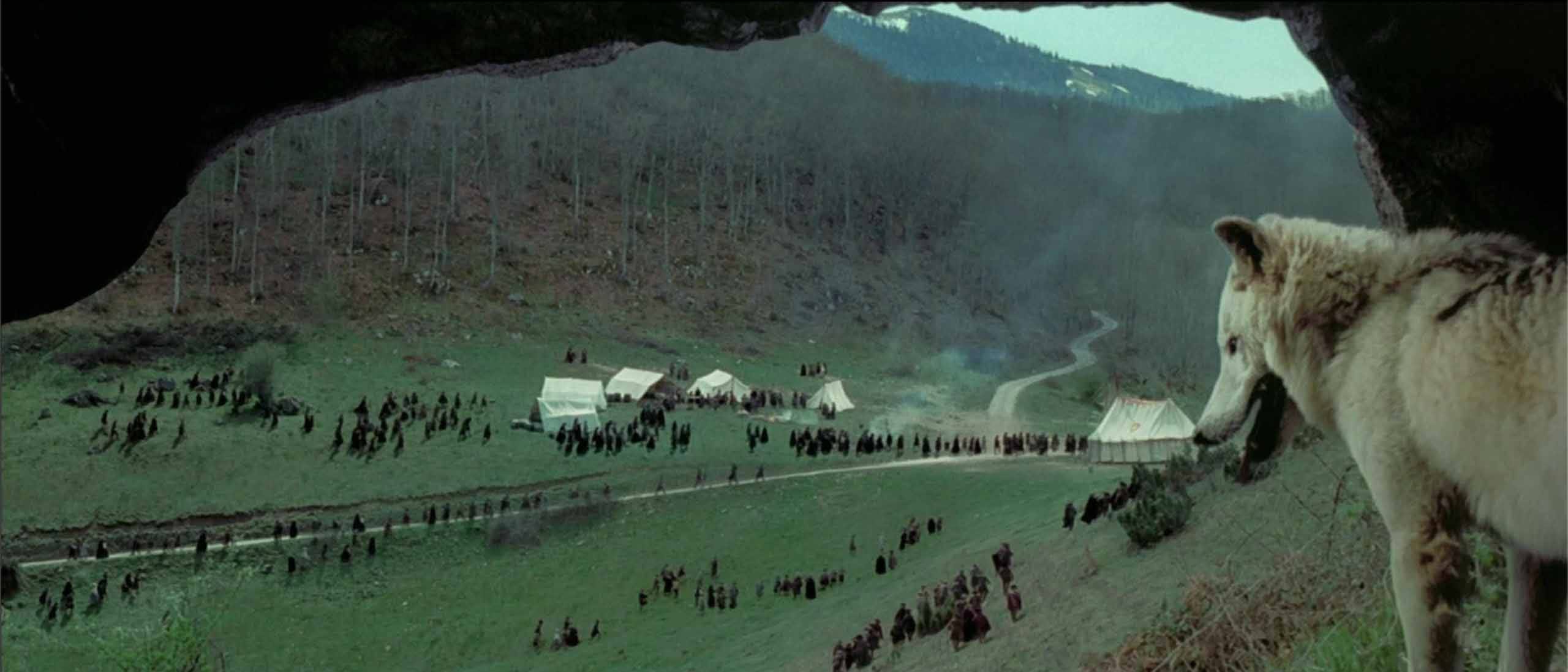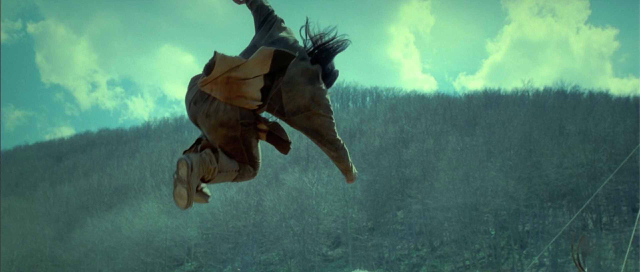Read Max: I would say the directorial flourish that marks Brotherhood as distinctly of its time is "sudden under-cranking," used most often in the movie's frequent sweeping helicopter shots. The under-crank treatment, a technique also used in music videos and American horror movies of the era, gives a jerky, supernaturally sped-up quality to the motion across the landscape, and communicates an affect I would describe as "spooky/crazy."