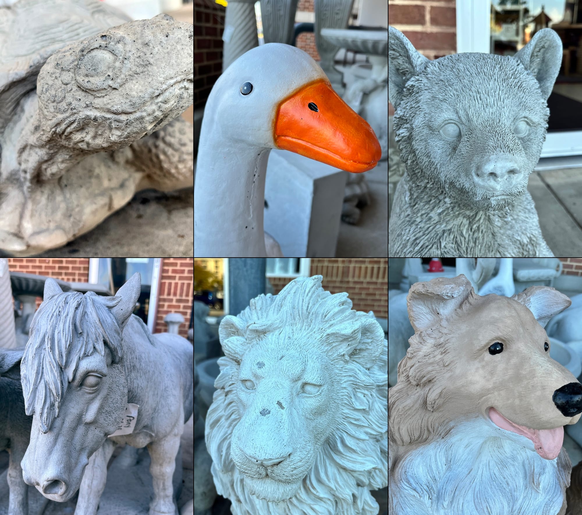 Animal-shaped lawn statues for sale out in front of Twin Brook Furniture in Cockeysville, MD