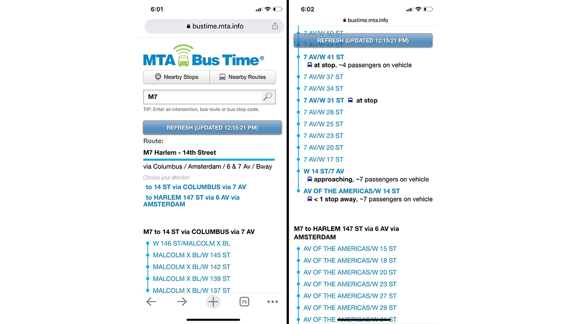 SPACE IS TIME, and knowledge is power, and the knowledge of when the bus is really going to come is the power to bend space and time to your will. The countdown clocks in the subway system are a confusing and unreliable mishmash of different information feeds, but if you point your phone's browser to bustime.mta.info, it will tell you exactly what's going on with the bus you need, one stop at a time or along the entire route.