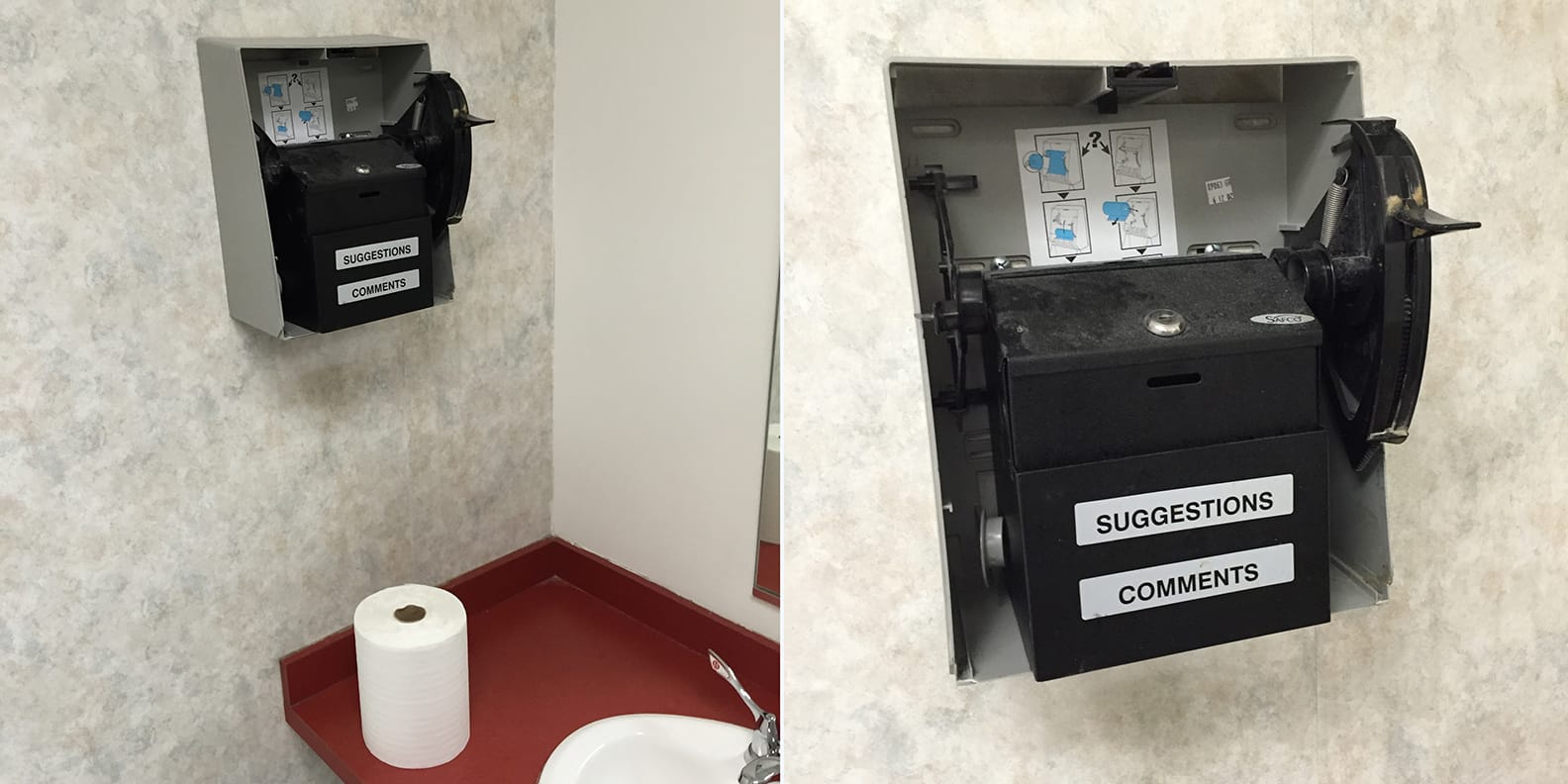 For months, there was a SUGGESTIONS COMMENTS box sitting on the counter in one of the lavatories. One day I realized placing the SUGGESTIONS COMMENTS box inside the—also for months—out of order paper towel dispenser was The Thing Itself, as far as Form Follows Function. In a society, the roll of paper towels set on its side, sitting there, outside a malfunctioning paper towel dispenser, in proximity to water splashes from the lavatory sink, frequently with wet evidence of coworkers ripping off pieces of moist-on-the-edge paper, is a low form of existence.