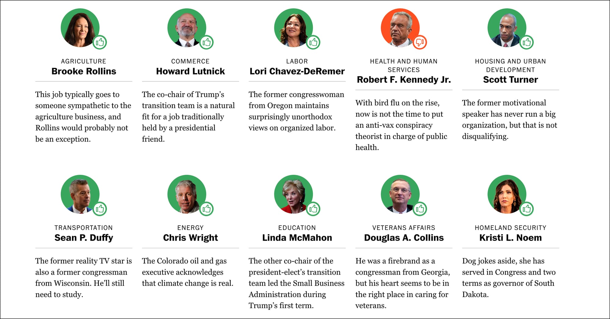 Of the 23 nominees, four earned the red thumbs-down: Pete Hegseth for Secretary of Defense, Robert F. Kennedy Jr. for Secretary of Health and Human Services, Russell Vought for head of the Office of Management and Budget, and Tulsi Gabbard for Director of National Intelligence. And those four nominees absolutely do have no business being appointed to those positions! Hegseth is a Christian nationalist fanatic with Crusader tattoos, a history of openly bigoted public remarks specifically about military personnel, a widely reported drinking problem, a detailed rape accusation against him, and complete failure in his extremely small-scale executive experience. RFK Jr. is an anti-vaccine crank whose ventures into public health already have a body count. Vought has drawn up a project to abuse and force out civil servants en masse in the hopes of breaking the federal government's ability to regulate. Gabbard is a conspiracist with a history of Hindufascist sympathies and shady foreign ties.