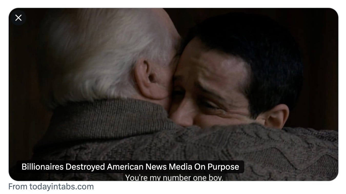 ...Earlier this week I met someone new and he asked me what I do for a living, and I said “I’m a writer,” and he said “Oh, what do you write?” This conversation happens often enough, and in virtually the same words, that I recognized right away where we were headed. I told him about Tabs and at that point although my new friend didn’t know it yet, we were already on a greased slide toward the moment where I would say: “…but these days I only write it once or twice a week, because the American news media has been systematically and intentionally destroyed by a handful of billionaires.”