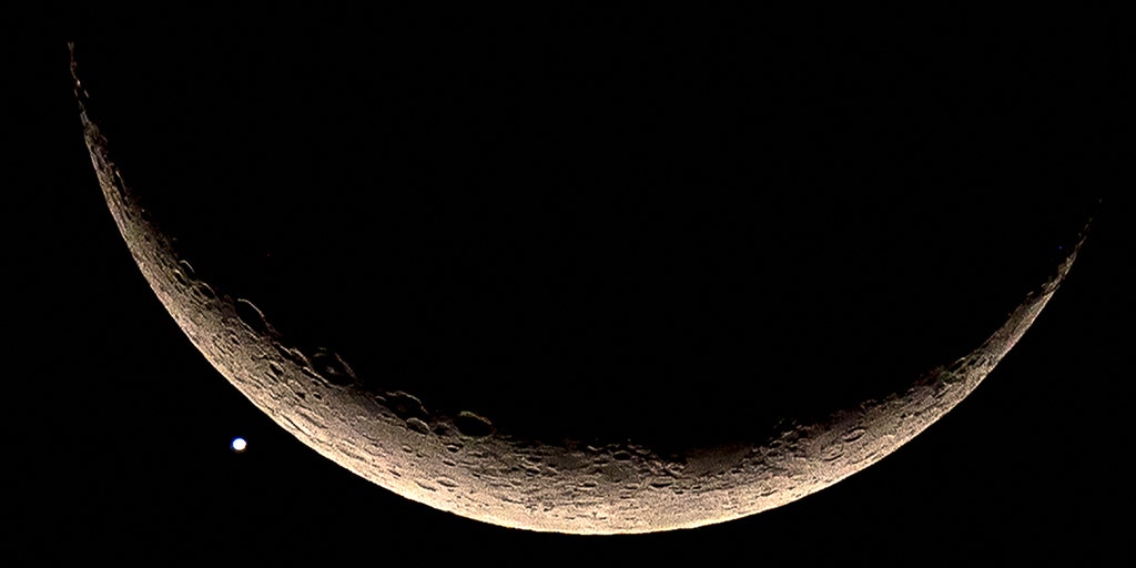 Just before sunrise on April 25, a conjunction of the crescent moon, Venus, and Saturn should produce a sort of smiley face in the sky, albeit tilted over and with the eyes mismatched and fairly far away from the mouth.
