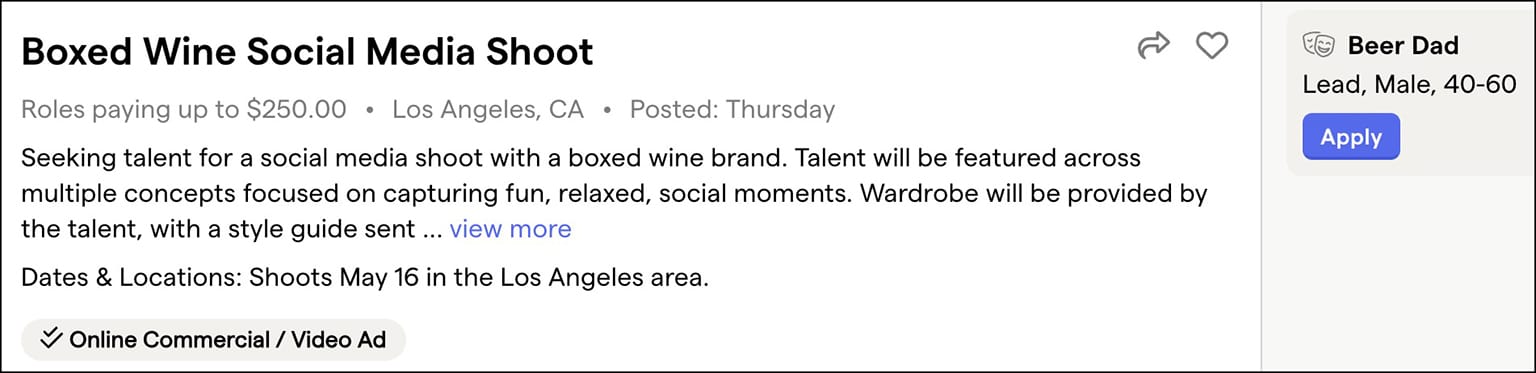 Every once in a while Joe scrapes the casting sites looking for an easy payday for him or his van. Recently he's been scanning the vast catalog of Backstage.