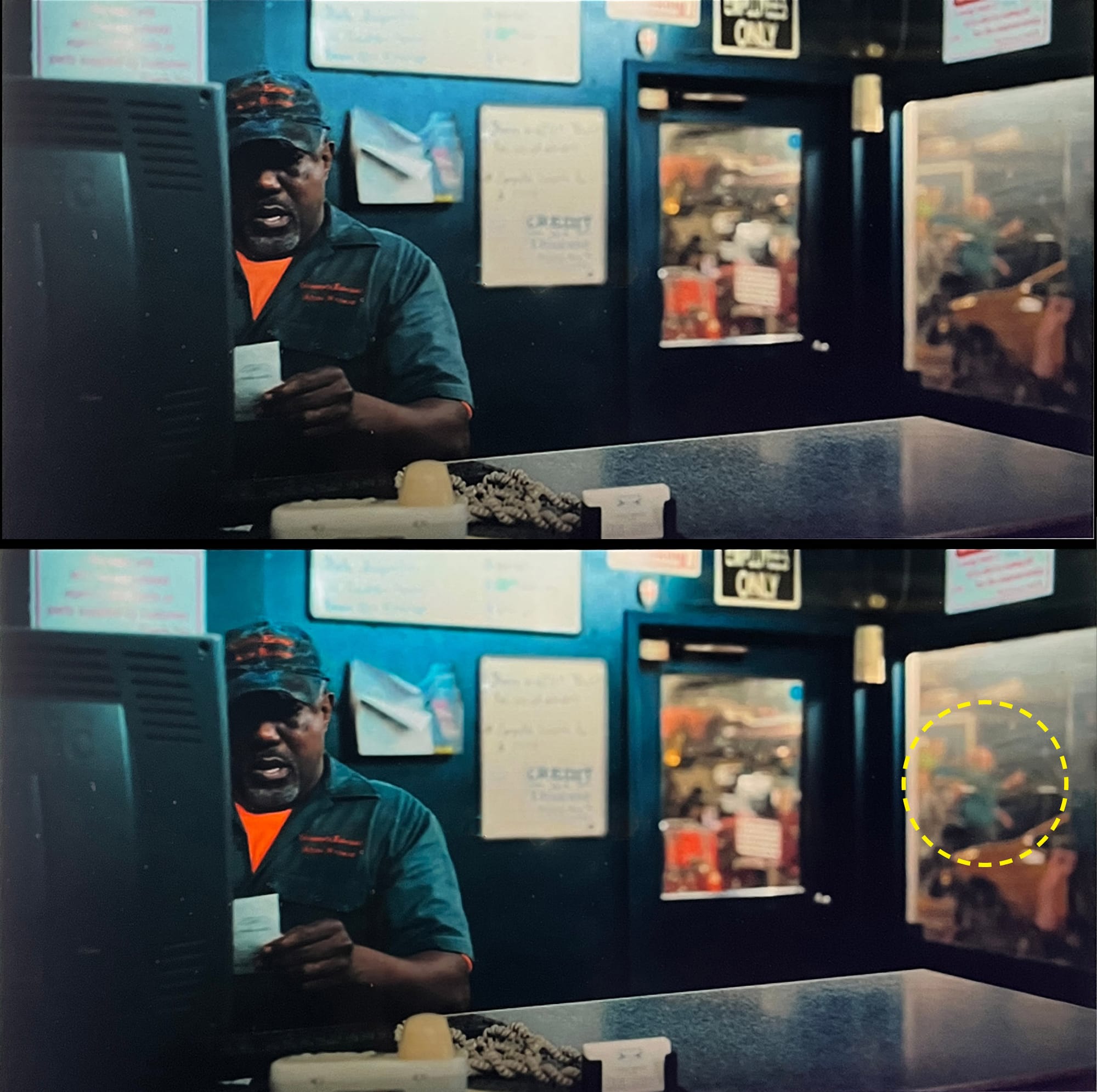 There's no point in showing you Joe's "clip," because his screen time is a fraction of a second, so here's a frame with a helpful In Search of Bigfoot–style locator. Of his latest foray into Getting Paid, master thespian MacLeod remarked "My 1989 Toyota Van made more than I did. They saw me drive up in it and paid me so they could to use it in the auto-shop scene." The van did not survive the cutting room floor, but Joe cashed the check!